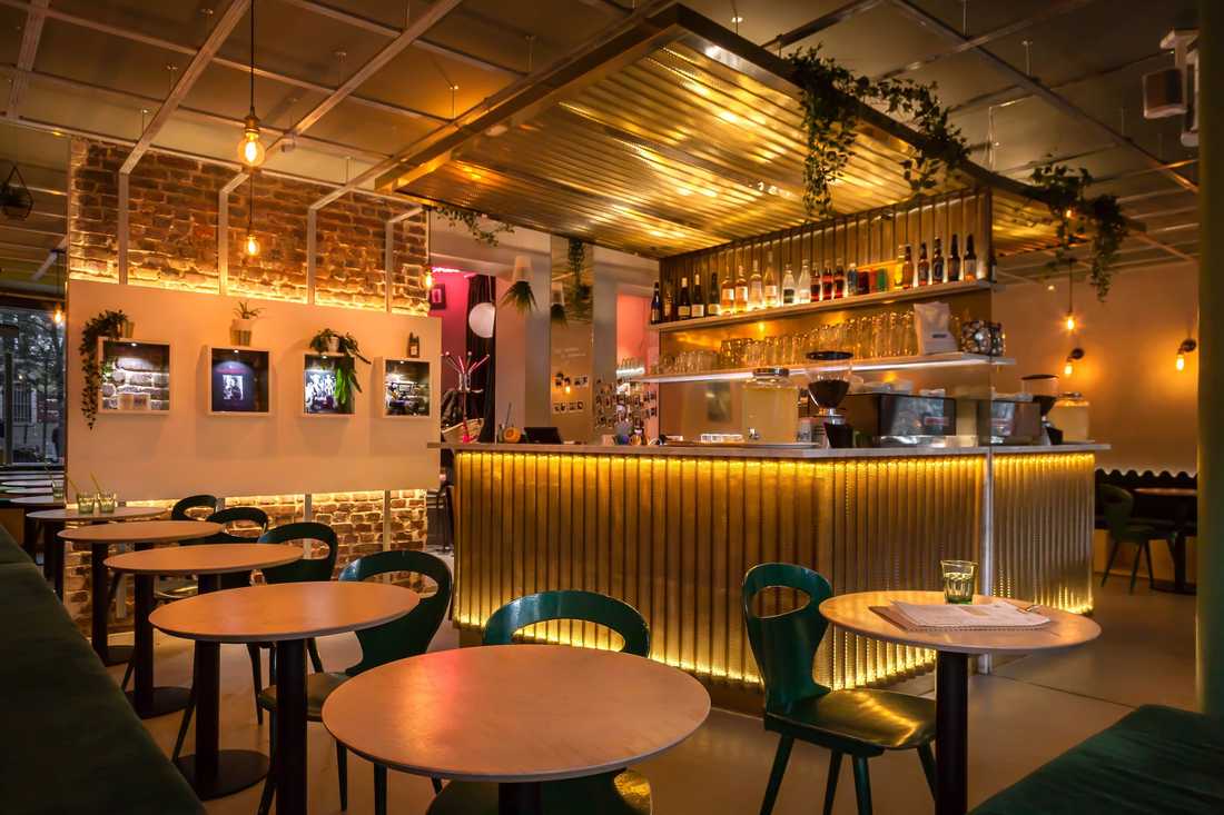 Aimé Ménilmontant est un bistrot de quartier à vins naturels qui propose du bio local sourcé. À mi-chemin entre le food market et le bistrot d’antan, le design puise son inspiration dans les stands du marché. Le calepinage des structures métalliques et l’ondulation des bâches ont orienté nos premières esquisses. Contrebalancé par les matières et éclairages issus des bistrots parisiens, Aimé Ménilmontant est un antre chaleureux, hybride et actuel.